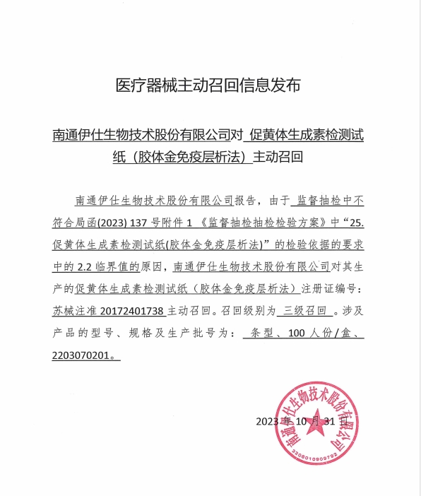 近期,南通伊仕生物技術股份有限公司生產的排卵檢測試紙,因第三方檢驗判定產品不符合技術要求中的2.2臨界值。